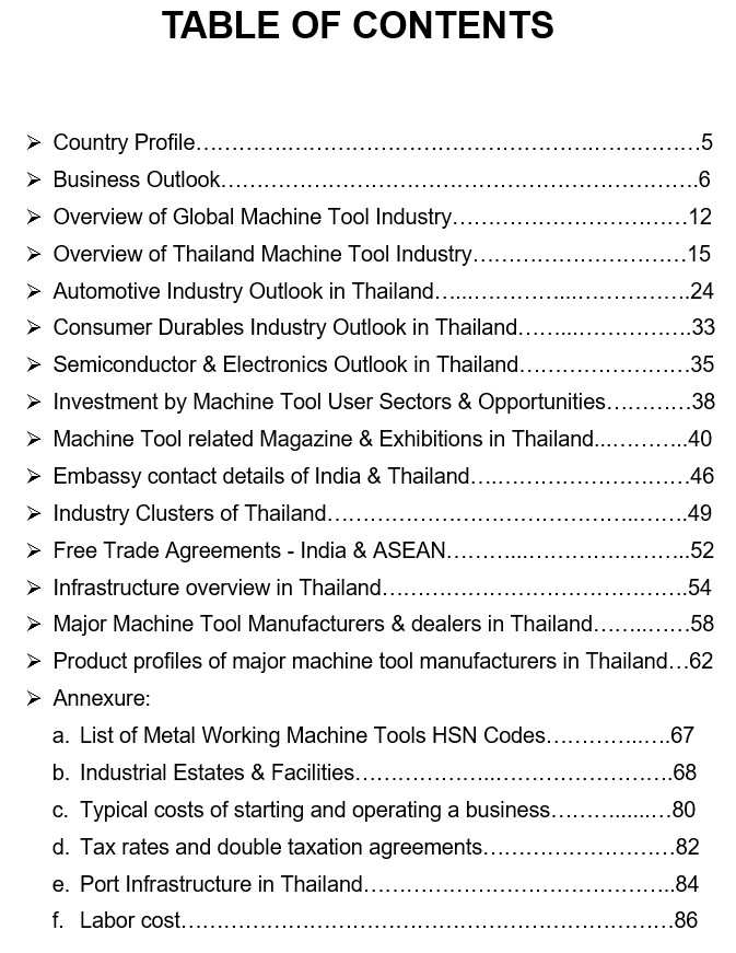 In addition, the report covers crucial aspects such as Thailand's infrastructure, major machine tool manufacturers and dealers operating within the country, and comprehensive product profiles of these manufacturers. The annexure includes a list of metalworking machine tool HSN codes for reference.