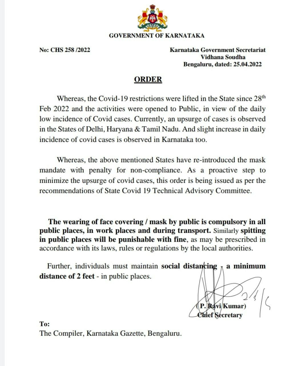 GoK order, Chief Secretary , Karnataka Govt. Secretariat, dated 2-May-2020 |